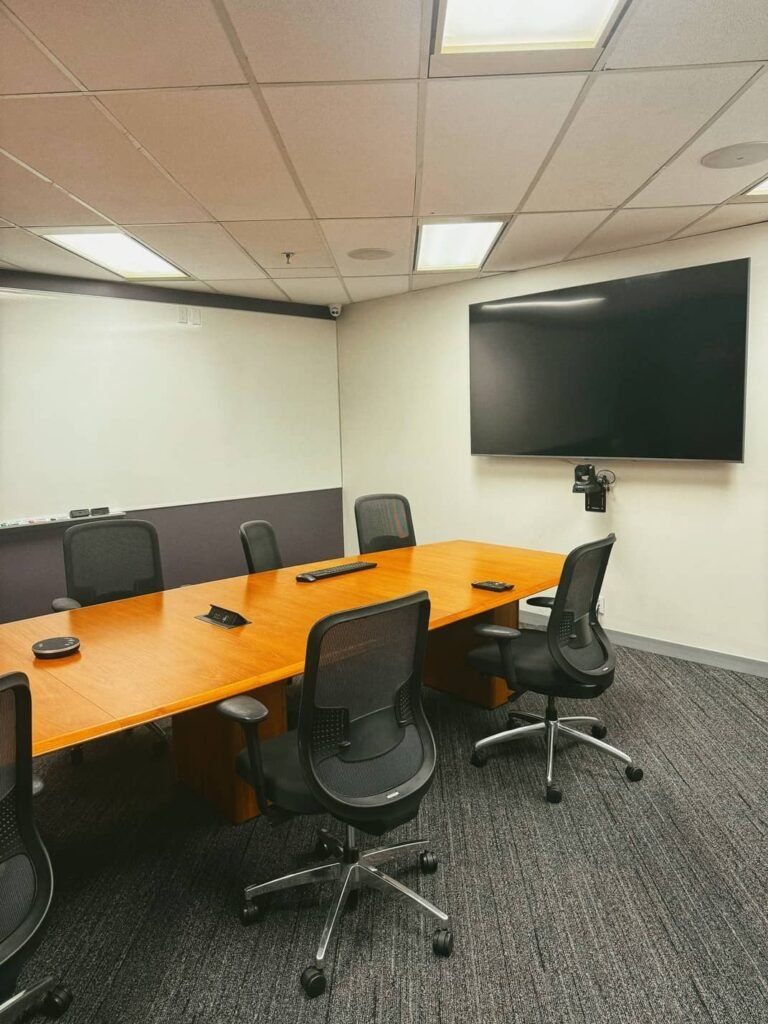 85” smart TV, 4K meeting webcam, and wall-covering whiteboard